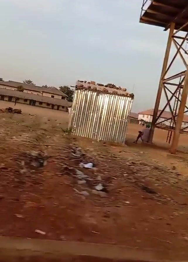dirt field in what appears to be a developing country. In the background, there are several low-rise buildings and some palm trees. There are also a few people walking around on the field. In the foreground, there is a dirt bank and some trash. A sign for the Nigerian Meteorological Agency can be seen in the distance. The video is shot from a moving vehicle.