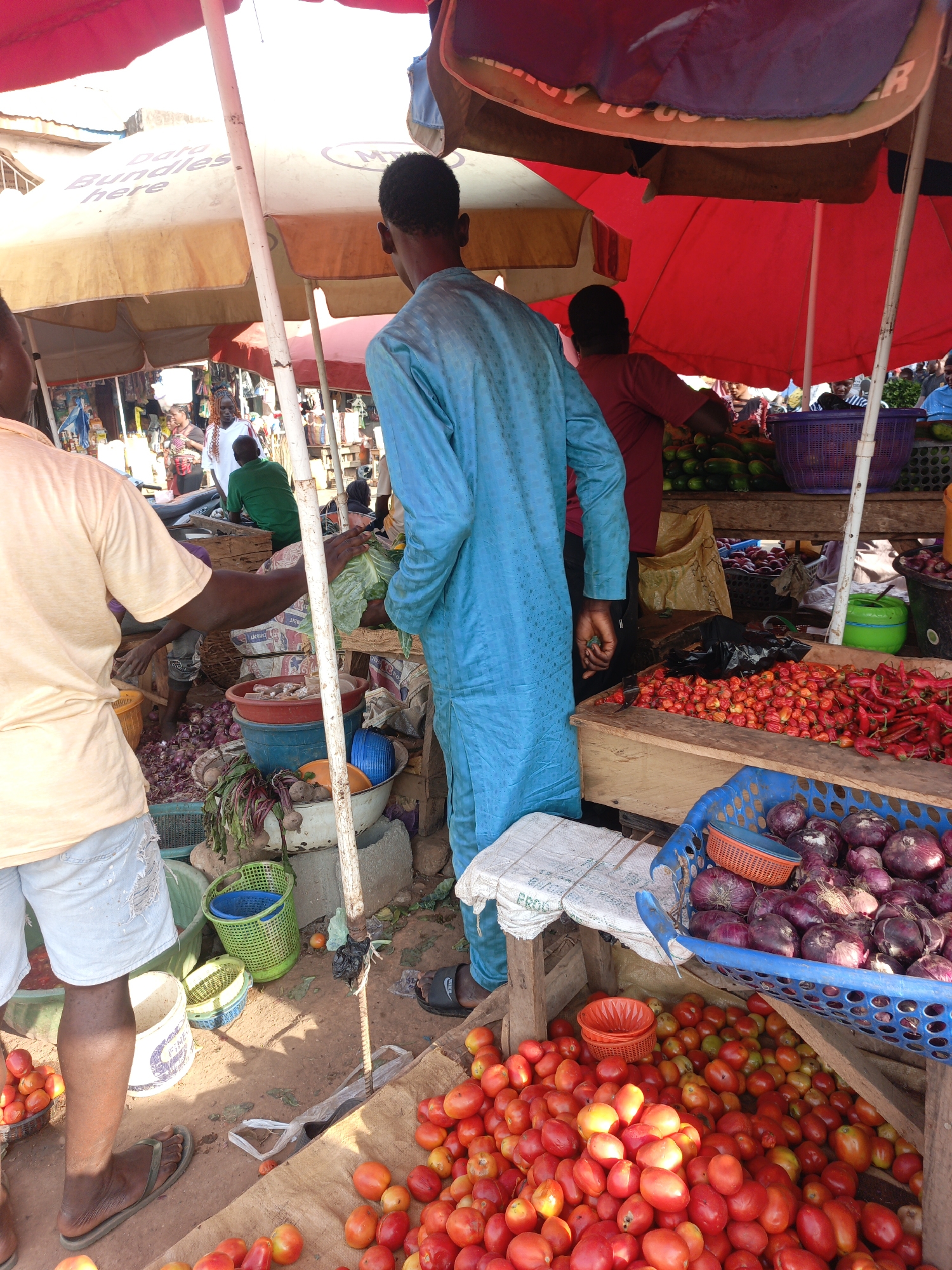 An outdoor market scene in Akwanga, Nigeria, shows multiple individuals among stalls laden with fresh produce under the shade of large market umbrellas. In the foreground, facing away from the viewer, a male subject in a light blue patterned long garment and dark sandals stands, holding a piece of green leafy produce in his right hand. To his left, another male subject, also facing away, wears a light yellow t-shirt and distressed light blue shorts with dark sandals, extending his right arm towards items on the ground. The immediate foreground features large quantities of red tomatoes spilled onto a brown tarp on the dirt ground. A blue plastic crate filled with red onions sits on a wooden surface next to smaller orange plastic strainers. On a wooden stall surface to the right, piles of red bell peppers and smaller orange/red chili peppers are displayed. Further back, green cucumbers are visible on another stall, and a large white basin holds red beets with their greens. Various plastic basins and baskets in colors like blue, green, and yellow are scattered on the dirt ground, some containing produce or other items. In the mid-ground, a subject in a red t-shirt is partially visible behind the subject in blue, appearing to arrange produce under a red market umbrella. Above, a beige market umbrella displays the partially visible text "Data Bundles here." Numerous other individuals, including one in a green shirt and another with braided hair in a white top, are visible in the crowded background, suggesting a bustling market environment with multiple vendors and customers. The ground is exposed dirt, and the scene is illuminated by bright daylight.
