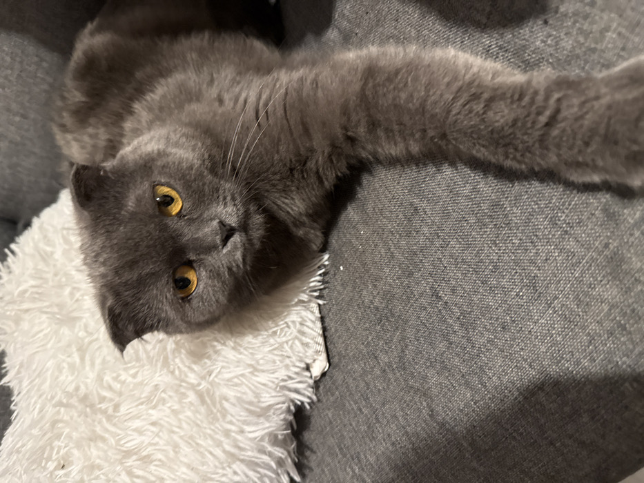 - "The image displays a dark gray, short-haired cat, identified by its folded ears as consistent with a Scottish Fold breed, resting on a textured gray fabric surface, likely a sofa or couch" by FM-FzwD83, licensed under CC BY 4.0