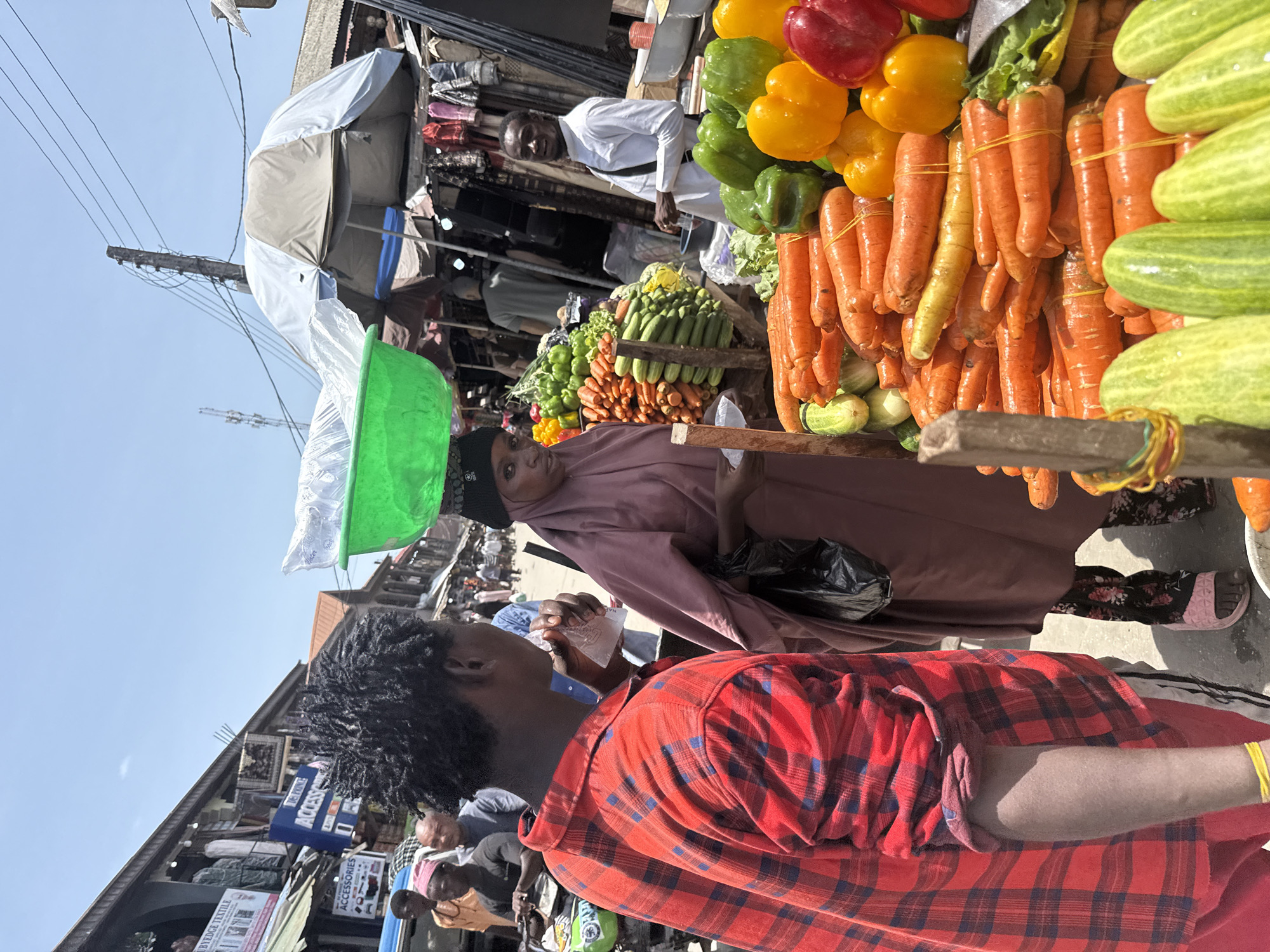 A bustling market scene in Ado, Nigeria, unfolds in this slightly tilted, medium shot. A vendor in a mauve garment and patterned pants stands behind a cart laden with fresh produce. Carrots, peppers (red, yellow, green), cucumbers, and other vegetables are piled high. She carries something with a green top on her head and holds a black plastic bag. A customer wearing a red plaid shirt is in the foreground, drinking from a small plastic bag. Other people are visible in the background, amidst a mix of stalls and merchandise under corrugated metal roofs and awnings. Utility poles with wires are visible against the clear sky.