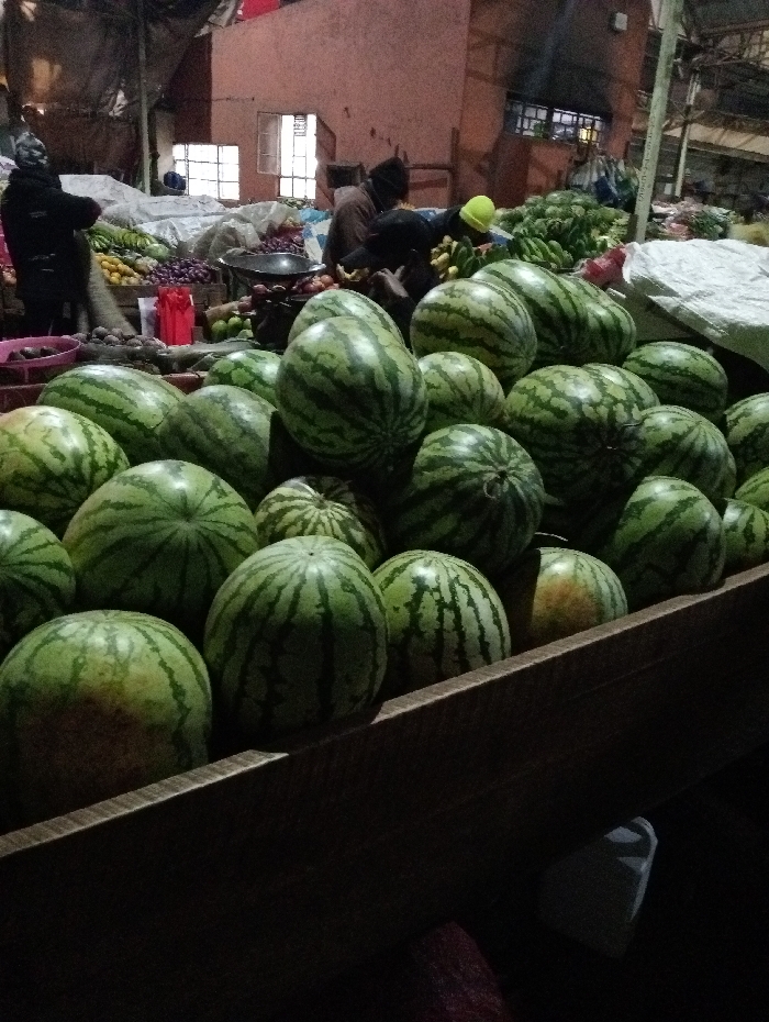A display of watermelons fills the foreground, stacked within a wooden structure. Vendors are seen amidst an array of other produce, including bananas and greens, in the background. The scene appears to be a bustling market with people milling about. The lighting is dim, giving the photo a slightly dark, enclosed feel. A few windows are visible, providing some natural light.