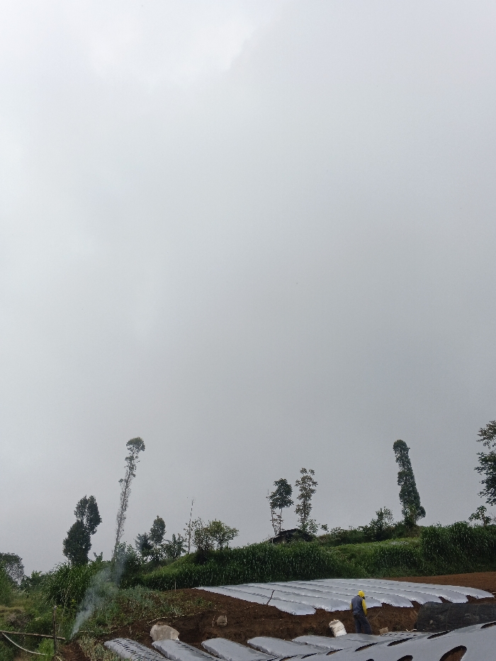 The image depicts a rural agricultural hillside in Pinnwe, Myanmar, under an entirely overcast, pale grey sky. The lower two-thirds of the frame present sloped, cultivated land with dark brown soil. Numerous parallel rows of white or silver plastic mulch sheeting are laid over prepared planting beds. In the lower right-midground, a single individual is observed in a bent posture, seemingly working on one of these mulched rows. This person wears a yellow hard hat, a dark blue long-sleeved shirt or jacket, and dark trousers. A thin plume of light grey smoke rises from the lower left foreground, originating from an obscured source. The midground and background display a dense line of varied green vegetation, including tall, slender trees with sparse foliage and shorter, dense green crops, marking the upper boundary of the farmed area.