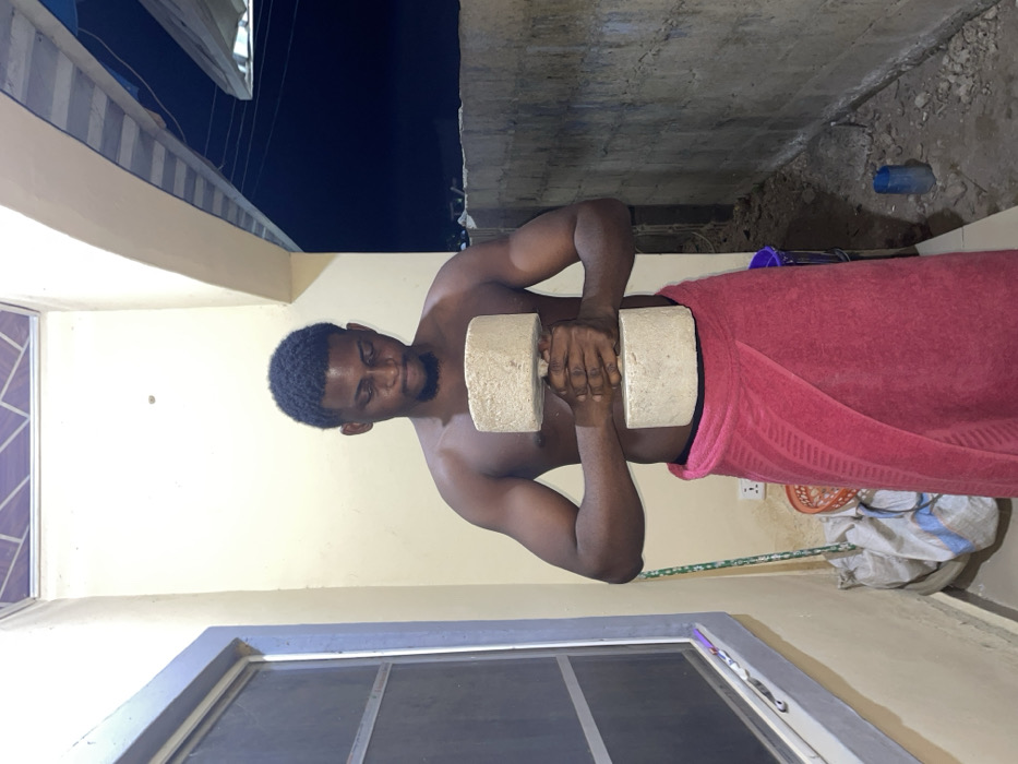 A muscular man wearing a pink towel holds a dumbbell with large, round ends. He is shirtless and appears to be working out indoors. The background shows a window, a wall, and the corner of a building under a dark sky. The scene has an improvised, home-gym feel.