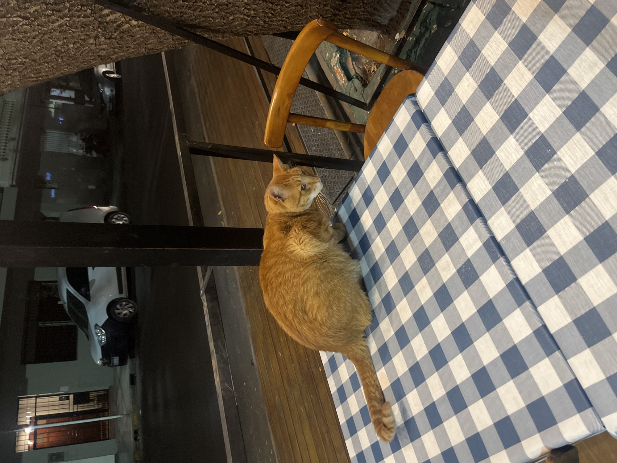 - "An orange tabby cat is centrally positioned on an outdoor dining table, which is covered by a blue and white checkered tablecloth" by FM-dFHXv1, licensed under CC BY 4.0