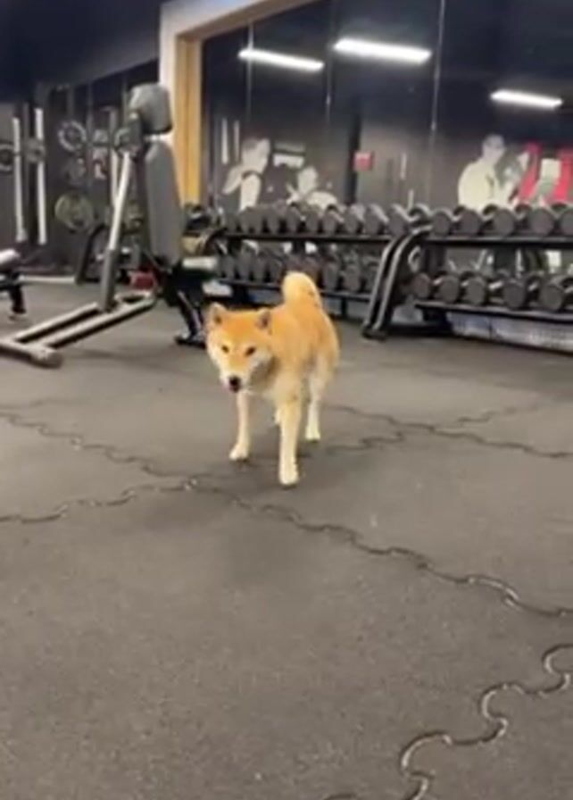A Shiba Inu dog walks in a gym. The floor is covered in black foam tiles. There are exercise machines and racks of dumbbells in the background. The dog walks towards the camera with its tongue hanging out, then turns to the left. A person says, "Come to me."