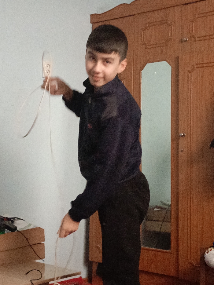 A young male is depicted indoors, within a residential room in Qoraqosh, Uzbekistan. The subject, appearing to be a pre-teen or early teenager with short dark hair, stands with his body slightly angled to the left, looking towards the viewer with a faint smile. He is dressed in a dark blue, long-sleeved, zippered jacket and black trousers. His right hand holds a white, two-outlet power strip or extension socket, from which a thin white electrical cable extends. He is actively manipulating this cable with both hands, creating a distinct loop in the air. To the right of the subject, a large wooden wardrobe with two doors is visible, featuring carved decorative elements and a rectangular mirror on its right door. The background wall directly behind the male is light blue. In the lower-left foreground, a segment of a light-colored wooden or cardboard box is visible, supporting a dark cable, with a partial red object discernible on the floor below.