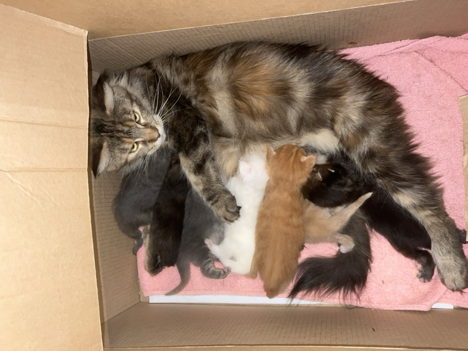 A domestic long-haired tabby cat, displaying brown, black, and tan fur with yellow-gold eyes, is observed lying on its right side inside a cardboard box. The box is lined with a pink towel. Seven kittens are present with the adult cat: two gray, two white, one orange, and two black. Multiple kittens are actively suckling from the mother's underside, specifically the orange, white, and black kittens. Other kittens are resting near the mother. The adult cat's expression is attentive. The scene is located in Rusanovo, Russia.