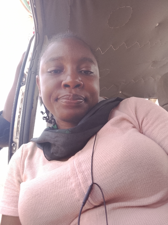 The image depicts an adult female situated within the interior of a vehicle. She has dark skin and short, dark, coiled hair, and is looking directly at the camera with a neutral to slightly smiling expression. She is wearing a light pink, long-sleeved, waffle-knit shirt and a dark scarf around her neck, which exhibits a subtle green pattern on its left side. A black wired earphone extends down her chest. The vehicle's interior features a light-colored fabric headliner with decorative zigzag and oval stitching. To the subject's left, a portion of an open vehicle door frame or window is visible, through which bright exterior light is entering. A dark-sleeved arm is partially discernible on the far left, resting near the door frame. There is no visual information within the image to ascertain the specific location as the city of Ibi, Nigeria, or any other precise geographical point. The scene is illuminated by ambient daylight.