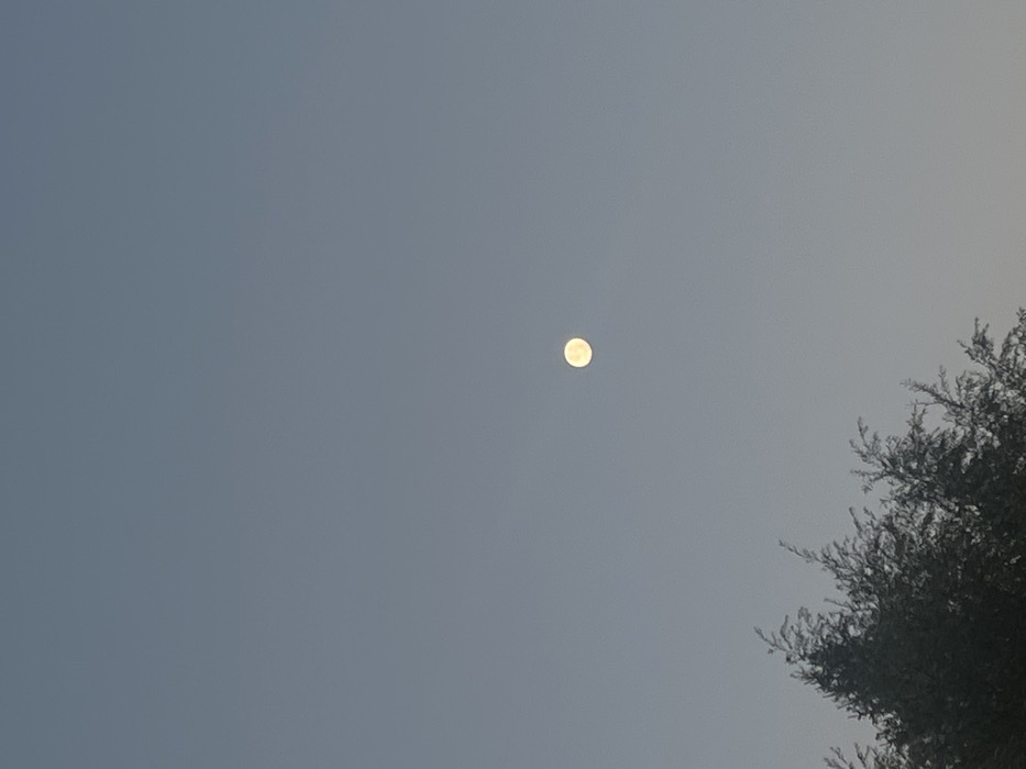 A daytime view shows a near-full moon suspended in a pale blue sky