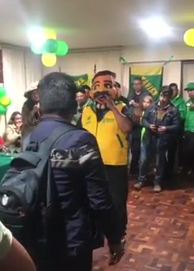 The video depicts an indoor gathering of people in what appears to be a club or event space. A person in the center is wearing a large, caricature-like mask of a bearded man, dressed in a yellow vest and black clothing. They are dancing and seemingly singing or lip-synching to music. The room is decorated with green and yellow balloons and a flag with text related to “Xavier”. Other individuals are standing around watching, some recording with phones. The flooring has a wooden pattern and the lighting is bright, contributing to an event-like atmosphere.