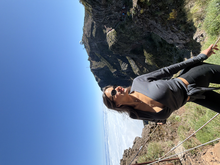 The image depicts an adult female posing on a high-altitude mountain path under a clear blue sky, overlooking a widespread cloud inversion. The scene is located on a high mountain peak, specifically the Pico do Arieiro viewpoint, within the broader region of Câmara de Lobos, Portugal. The woman is positioned in the foreground, angled slightly left with her head turned to her right, looking away from the camera. Her facial expression shows a faint smile. She possesses long, dark brown hair, which is partially displaced by wind. She wears dark, rectangular sunglasses. Her attire consists of a dark, likely charcoal or black, long-sleeved wrap top with a deep V-neck, exposing her upper chest, and matching black form-fitting trousers or leggings. She accessorizes with a stud earring on her left ear, a short necklace with a small pendant, and a longer, delicate chain featuring a small star-shaped pendant. To the immediate left of the woman, a series of parallel metal safety cables or ropes are visible, secured into the rocky and sparsely vegetated ground. The path she stands on is narrow, rocky, and features patches of green grass. Below this path, a dense layer of white, cumulus clouds forms a distinct cloud inversion, extending horizontally across the mid-ground. Beyond the cloud inversion and in the distant background, rugged, dark grey and brown mountain peaks rise. The highest visible peak, positioned right of the frame's center, is crowned by a large, white, spherical radar dome and an adjacent slender communications tower. A winding hiking trail with discernible steps and safety railings can be observed along a distant ridge to the right, populated by several small human figures. The sky above is uniformly clear and deep blue. The entire scene is brightly illuminated by direct sunlight, casting subtle shadows.