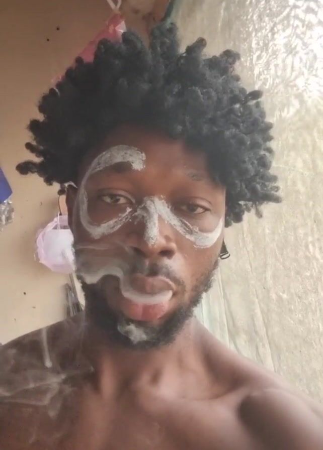 A man with black, textured hair and a short beard stands shirtless, facing the camera. He has white paint markings around his eyes and on his nose. He is exhaling smoke from his mouth. The background appears to be an interior space with a window behind him. Hanging objects and various items are visible in the periphery.