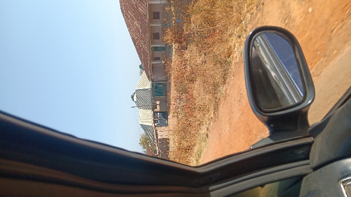Captured from within a car, the scene shows an exterior view through an open window. The side mirror dominates the right side of the frame, reflecting a road. Outside, dry vegetation fills the landscape alongside the road. Several buildings with varied roof types are visible in the distance. The sky is bright and clear. The composition is partially obscured by the car's interior, adding a sense of being on the move.