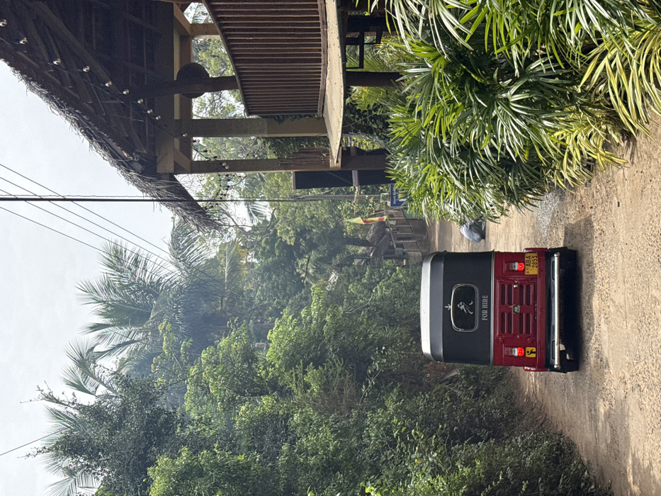 A tuk-tuk, red and black with "FOR HIRE" marked on its side, is parked on a dirt road. Lush green vegetation frames the vehicle, with glimpses of trees filling the background. Above, a building with a thatched roof overhangs the scene. Electrical wires stretch across the sky, adding a modern element to the natural landscape.
