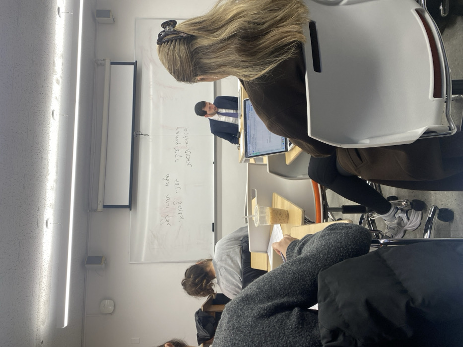 In a classroom setting, a man in a suit stands at a whiteboard displaying Hebrew writing. A woman with blonde hair and a claw clip sits in front, using a laptop. Another student is seen in a grey sweater. An iced coffee sits on the desk beside her. The classroom features fluorescent lighting and a projector screen.