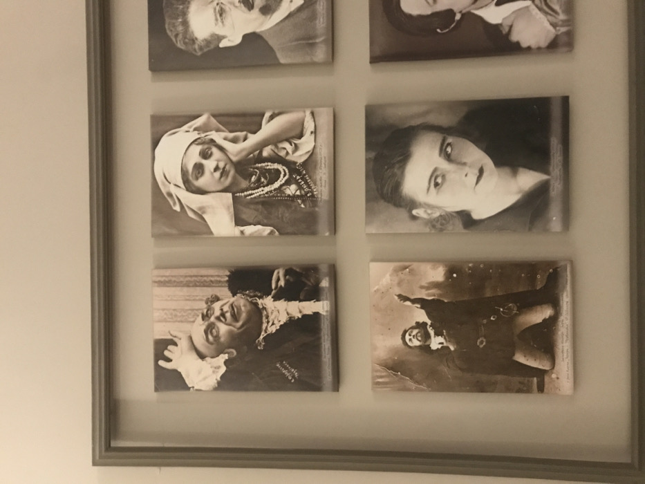 Six framed black and white photographs are mounted on a beige wall. The photographs are arranged in two rows of three, and all of them are portrait oriented. The top left photograph shows a man's portrait, the top middle photo shows a man's portrait, and the top right photo shows a woman's portrait. The bottom left photo shows a man's portrait, the bottom middle photo shows a woman's portrait, and the bottom right photo shows a woman's portrait. The photographs are in a building located at 49.844 latitude and 24.027 longitude, which is located in the city of L'viv, Ukraine.