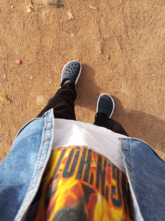 The image depicts the lower torso and legs of an individual standing outdoors in Barakin, Nigeria, viewed from a first-person, downward perspective. The individual wears black pants, dark grey Crocs with white soles, a white t-shirt featuring an orange and yellow flame graphic with partial black text (appearing as "JOHNNY"), and a light blue denim shirt or jacket worn open. The ground is a uniform light brown, sandy, or dusty surface. A red bottle cap is visible on the ground to the upper left of the left foot, along with scattered small dried leaves and other detritus. The scene is brightly lit by natural light.