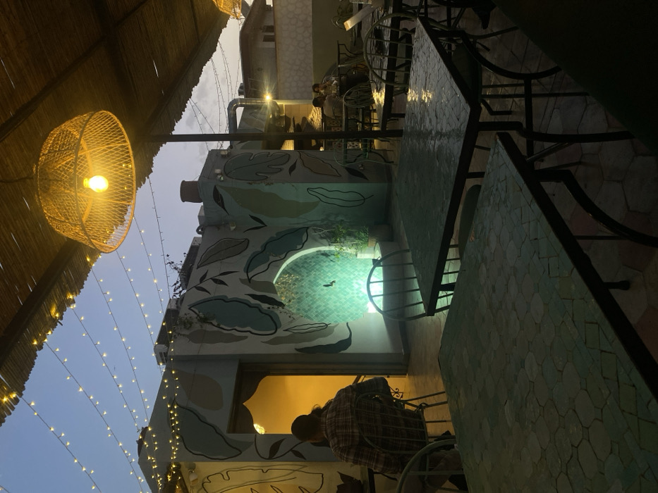 n outdoor dining area at a restaurant located in Agadir, Morocco. The coordinates, 30.426 latitude and -9.593 longitude, indicate this location is likely in the heart of Agadir, near the city center. The restaurant is decorated with a large, abstract mural depicting stylized leaves in shades of green and brown. There are several tables and chairs positioned under a canopy, which is illuminated by a string of fairy lights and a large, wicker pendant lamp. A single diner is seated at a table in the foreground, while another couple is seated at a table in the background. The restaurant is bathed in a soft, warm light from the hanging lamp. The tiled floor and the intricate details of the tables suggest a Moroccan aesthetic.