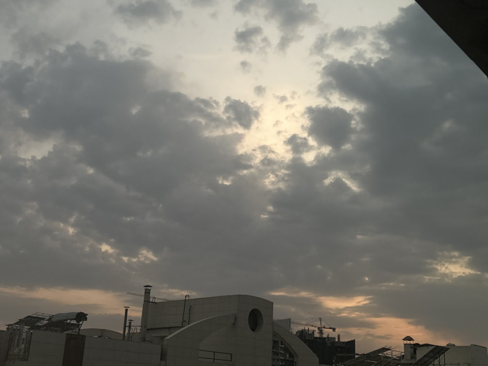 The image displays an urban environment under an overcast sky, observed from an elevated vantage point in Kafr Sousa Municipality, Syria. The upper two-thirds of the frame are dominated by dense, grey stratocumulus clouds, with diffuse bright light emanating from an obscured sun in the upper-center. A warm, orange-yellow glow is visible near the horizon on the right, suggesting either sunrise or sunset. The lower third of the image features the rooftops and upper sections of multiple buildings. On the left, a flat roof supports several solar water heaters, identifiable by their dark, tilted panels and cylindrical tanks. Below this, a light-colored building section features a prominent arched architectural element. Adjacent to it, another light-colored building exhibits a large circular cutout or window on its upper facade. Further right, multiple cylindrical chimneys or ventilation shafts rise from various rooftops. In the background on the far right, a red and white tower crane is visible above darker, partially constructed buildings, indicating an active construction site. No individuals or discernible actions are present in the scene; it is a static environmental depiction.