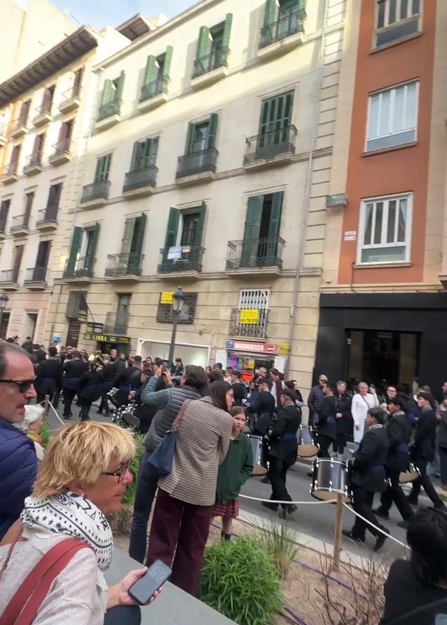crowd of people watching a marching band in a city street. The band members are wearing black uniforms and playing instruments, including drums and brass instruments. The crowd is standing on the sidewalks and in front of buildings, some of which have balconies. Some people in the crowd are taking pictures or videos with their phones. The buildings are various colors, including orange and white. The sky is blue with some clouds. There are trees and streetlights lining the street.