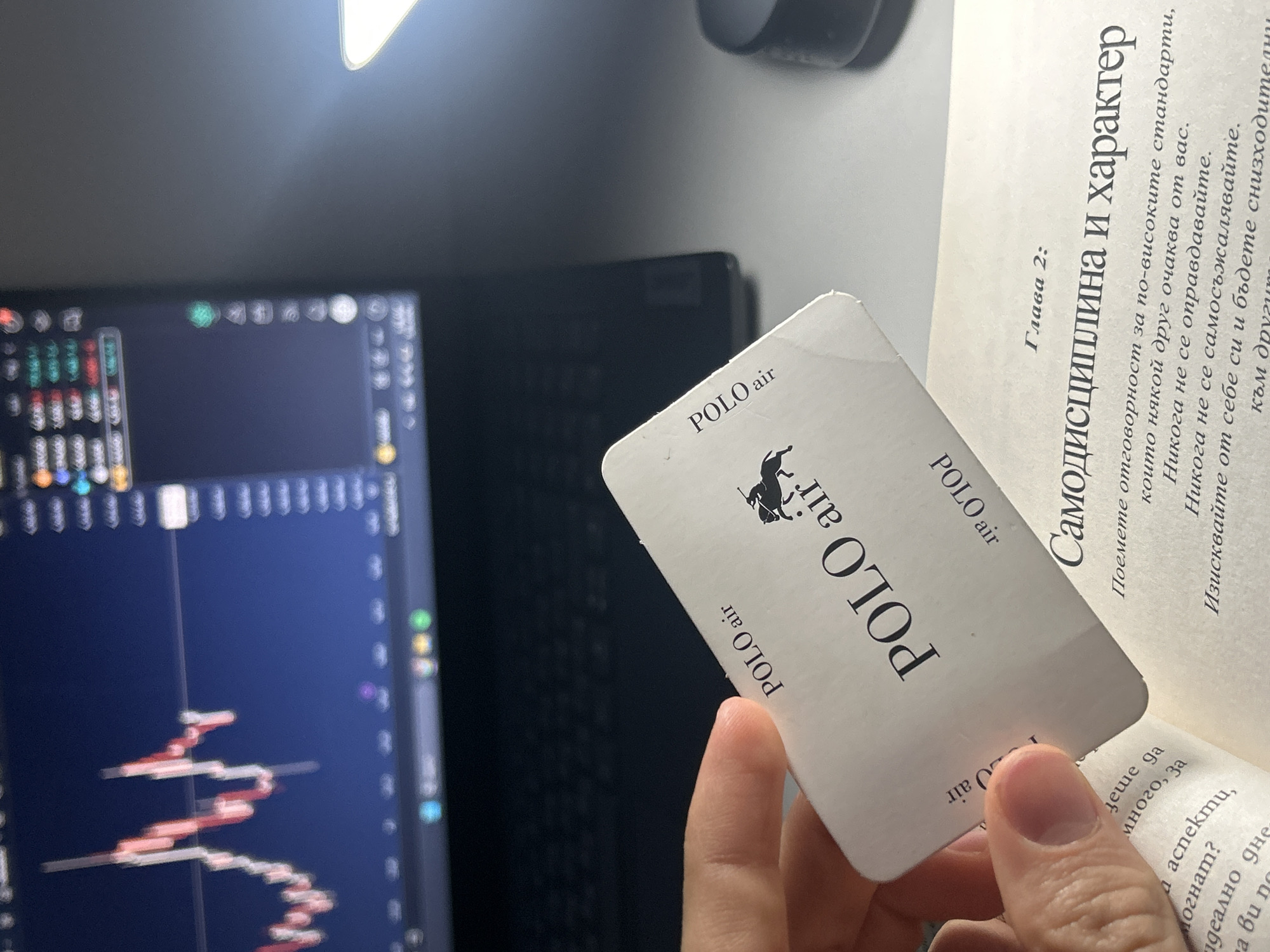 A hand holds a "POLO air" tag over an open book, displaying a chapter titled "Самодисциплина и характер" (Self-discipline and Character) in Bulgarian. The book sits on a desk or table next to a laptop, the screen of which shows financial charts. A light source is positioned above the scene, possibly a lamp. The location within Plovdiv, Bulgaria, cannot be determined from the visual information provided.