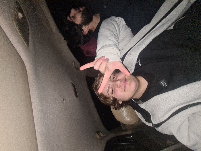 The image depicts two males inside a vehicle at night. In the foreground, a male with light brown, medium-length hair and a fair complexion smiles directly at the camera. He wears a black long-sleeved top with a small logo on the left chest, under an open, textured light gray or off-white zippered jacket with dark stripes on the sleeves. His right hand is raised, forming an 'L' shape with the index finger and thumb, partially obscuring the right side of his face. Behind and to the right of the foreground subject, a second male is partially visible. He has dark, curly hair and a beard, and his face is in profile, looking towards the right side of the frame with his eyes appearing closed or downcast. He is dressed in a dark-colored garment. A distinct white, thick, possibly padded, object or piece of clothing is visible adjacent to his head and shoulder. The vehicle's interior ceiling is a light tan or beige fabric, showing minor discoloration and a small perforation. An overhead light fixture or control panel, dark in color, is also visible. A light-colored headrest is partially discernible behind the foreground subject. The external environment appears dark, indicating the scene takes place at night or in very low light conditions. The specific geographical location within Al-Qaboun Municipality, Syria, cannot be determined from the visual evidence presented.