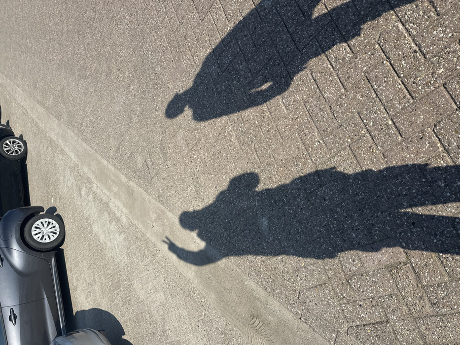 The image displays a paved outdoor area under strong sunlight, casting long, distinct shadows. Two human shadows are visible on the ground, composed of light grey-brown rectangular interlocking pavers. A concrete strip runs diagonally across the mid-ground. The shadow on the left, closer to the viewer, depicts a figure with its right arm raised, forming a "peace" sign (V-shape with two fingers). The shadow on the right is of an upright figure. In the upper left background, the rear and side of a dark grey hatchback car are parked, showing a silver hubcap on the rear wheel. A darker-colored vehicle with a silver hubcap is partially visible to its right. Faint tire marks are present on the paved surface near the left shadow. No specific landmarks identify the location within Lelystad, Netherlands beyond a generic outdoor parking or pedestrian zone.