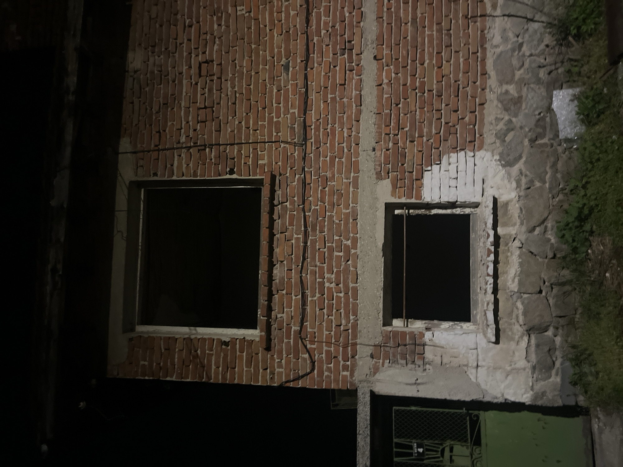 The image depicts the exterior of a building in Trud, Bulgaria. The building has a two-story facade with a mix of brick and stone construction. Two dark, empty window openings are visible. Electrical wiring runs along the brick wall. Vegetation is present to the right of the building, and a green door is at the base of the structure. The scene appears to be photographed at night or in low-light conditions.