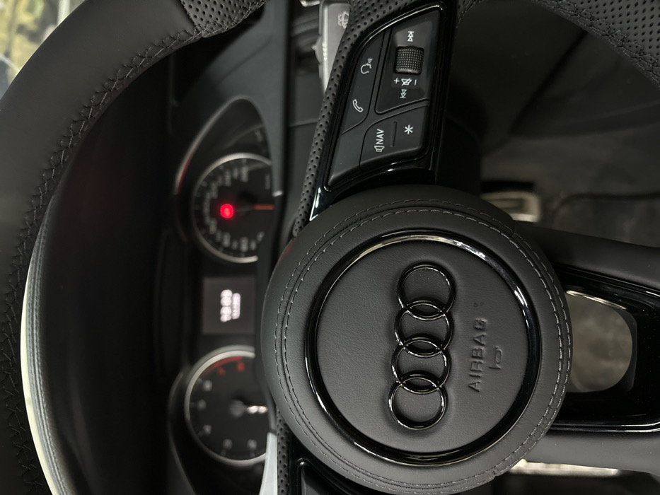 The image displays the interior of an Audi vehicle, captured from a perspective behind the steering wheel
