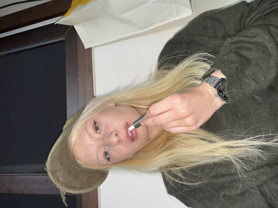 A young blonde female with blue eyes and winged eyeliner is depicted in an indoor setting in Namyangju-si, South Korea. She wears a distressed olive green baseball cap and a dark green knit sweater, with a silver digital watch visible on her left wrist. She is holding a green and white cylindrical object, appearing to be a lip product, to her slightly parted lips, suggesting application. The background features a dark, unidentifiable area, possibly a window at night, framed by a brown wooden structure. To the right, a white shopping bag is partially visible.