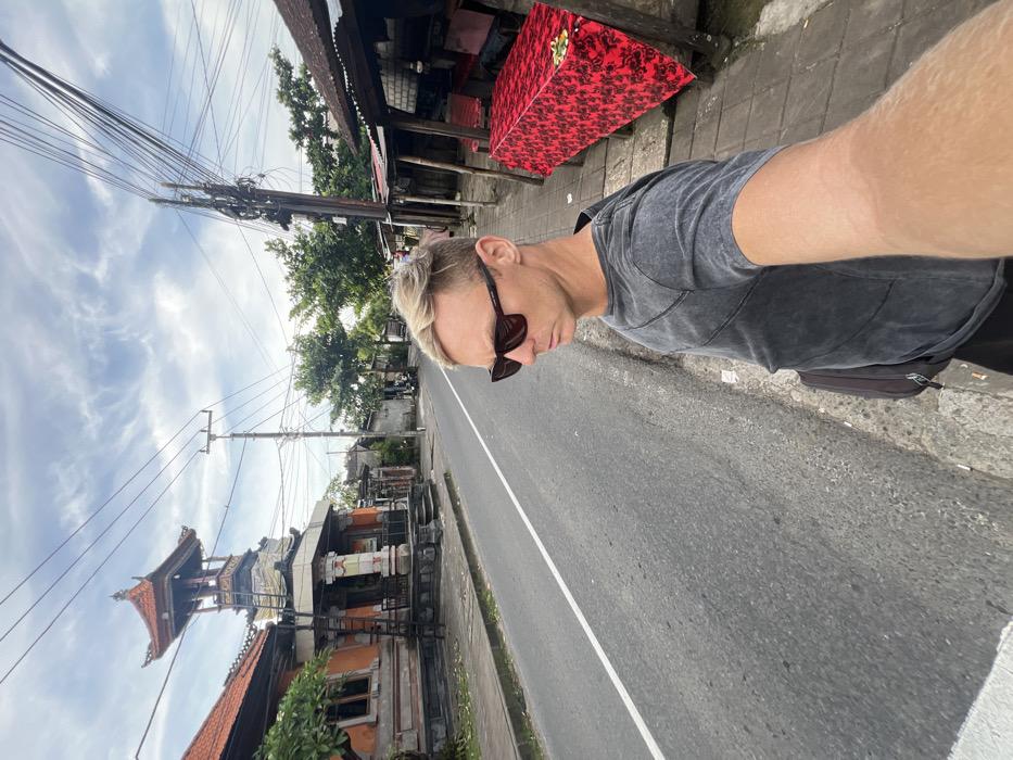 An adult male stands on a paved sidewalk next to an asphalt road in Lodtunduh, Indonesia. The man, positioned on the right side of the frame, is taking a selfie, holding a device out of view. He has light skin, short blond hair, and wears dark sunglasses, a dark grey t-shirt with diagonal stitching, dark pants, and a dark bag slung over his left shoulder. He faces slightly to his left, looking past the camera. The two-lane road features a solid white dividing line and appears clear of vehicles. On the left side of the road, a traditional Balinese-style building with an orange facade and a reddish tiled roof is visible. A multi-tiered structure with a red pagoda-style roof, possibly a kulkul tower, rises from the building's front. Some white material, possibly tarp or scaffolding, is wrapped around its base. A wooden utility pole with multiple wires stands further down the road on this side. On the right side of the road, behind the male subject, a series of simple structures with corrugated metal roofs line the sidewalk, resembling open-fronted stalls or small shops. One stall in the foreground features a table covered with a vibrant red cloth adorned with black floral patterns, with some items, possibly dishes, visible on it. A tall utility pole heavily laden with numerous black wires stands prominently on this side of the road. Green foliage from trees is visible in the background on both sides of the street. The sky is partly cloudy with scattered wispy clouds.