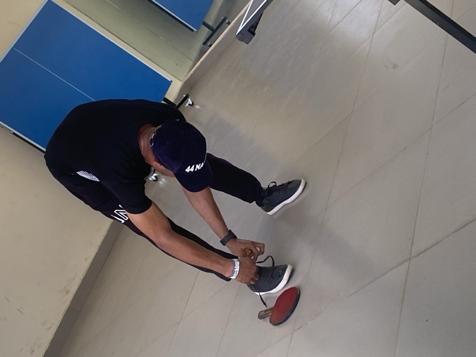 The image captures an individual in an indoor facility within Unguwar Sarki, Nigeria. The person, clad in a black t-shirt, black athletic pants with white side stripes, dark athletic shoes featuring white soles, and a dark blue baseball cap with white "44 NO" lettering, is depicted bending forward at the waist. Their attention is directed downwards as they actively tie the laces of their left shoe. A white wristband bearing partially legible text, possibly "breaking?", is on their left wrist, while a dark fitness tracker or smartwatch is on their right wrist. Resting on the light grey tiled floor, immediately to the left of the individual's left foot, is a red and black table tennis paddle. In the background, two blue table tennis tables with white markings and black support frames are visible, indicating a sports or recreation area. One table appears to be folded vertically against a light-colored wall. The floor exhibits a grid pattern from its tile construction.