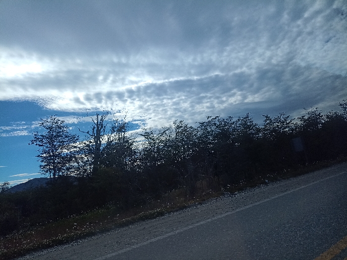 A road stretches into the distance under a cloudy sky with patches of blue peeking through. Trees line the roadside, casting dark shadows. A few trees stand out with bare branches. Low-lying vegetation fills the space between the road and the trees. A distant hill is faintly visible in the background. The scene suggests a remote, possibly rural, landscape.