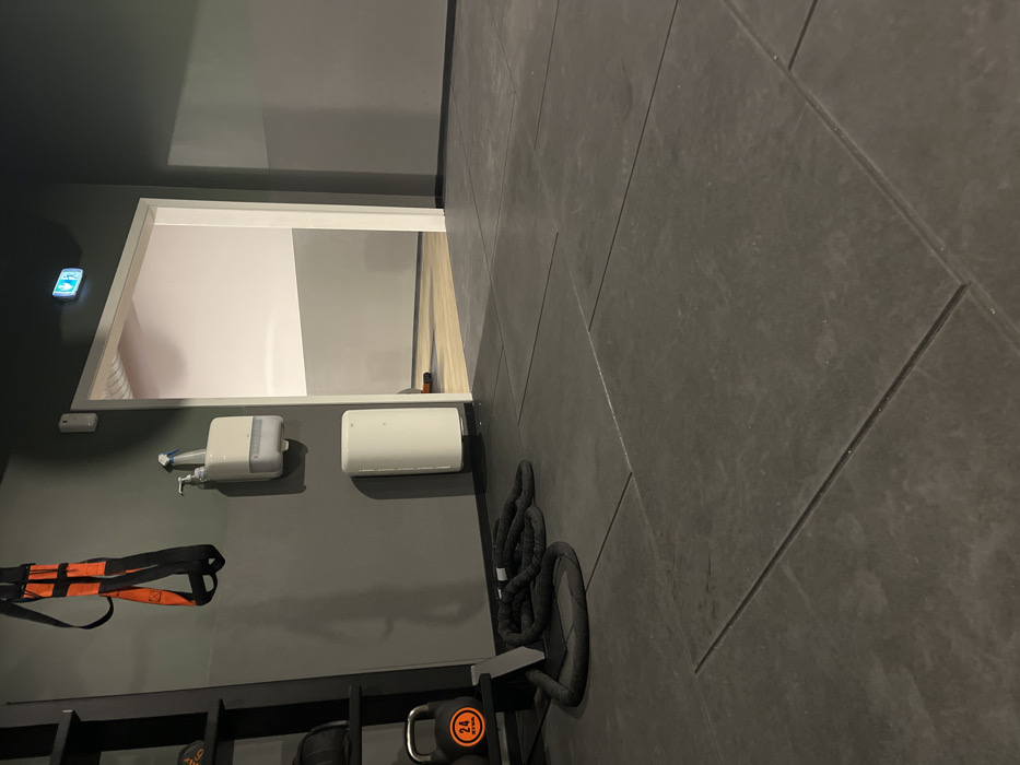 - "The image depicts an interior view of what appears to be a fitness facility, characterized by dark grey rubber floor tiles and dark grey walls" by FM-GJVN82, licensed under CC BY 4.0