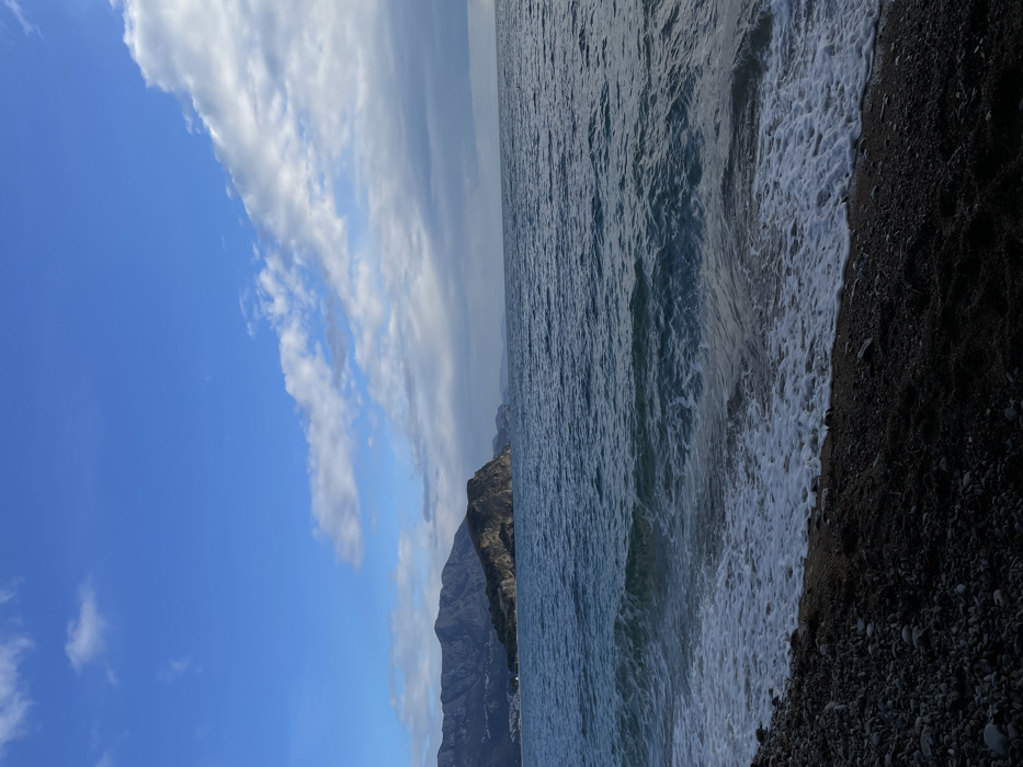 The image presents a panoramic coastal view in Budva, Montenegro, facing the Adriatic Sea. The sky occupies the upper two-fifths of the frame, displaying clear blue with scattered white cumulus clouds on the left and upper portions, transitioning to a denser layer of gray-white stratocumulus clouds towards the right and horizon. In the mid-ground, a prominent, vegetated island, identifiable as Sveti Nikola Island (Školj), rises from the sea. Behind the island, a range of dark, rugged mountains stretches across the horizon, exhibiting subtle indications of urban development at their base on the far left. The sea, a deep blue-green, shows moderate wave activity, with foamy white crests breaking along the immediate foreground. The beach foreground consists of dark pebbles and sand. No individuals, explicit man-made objects, or discernible actions/interactions are present in the scene. The overall environment is a natural seascape under partially cloudy conditions.