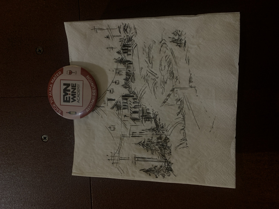 A napkin features a sketch of a rustic mountain landscape, including buildings, trees, and hills, rendered in a pen-like style