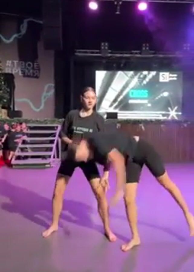 Two barefoot women are performing a dance on stage, wearing black t-shirts and black shorts. One woman is bent over while the other is standing behind her, holding onto her and lifting one of her legs in the air. They are surrounded by a group of other dancers in similar outfits who are standing on the sidelines. The stage is lit with purple and white lights and there is a large screen in the background displaying the word "CROSS." There is also a Christmas tree to the left of the stage.