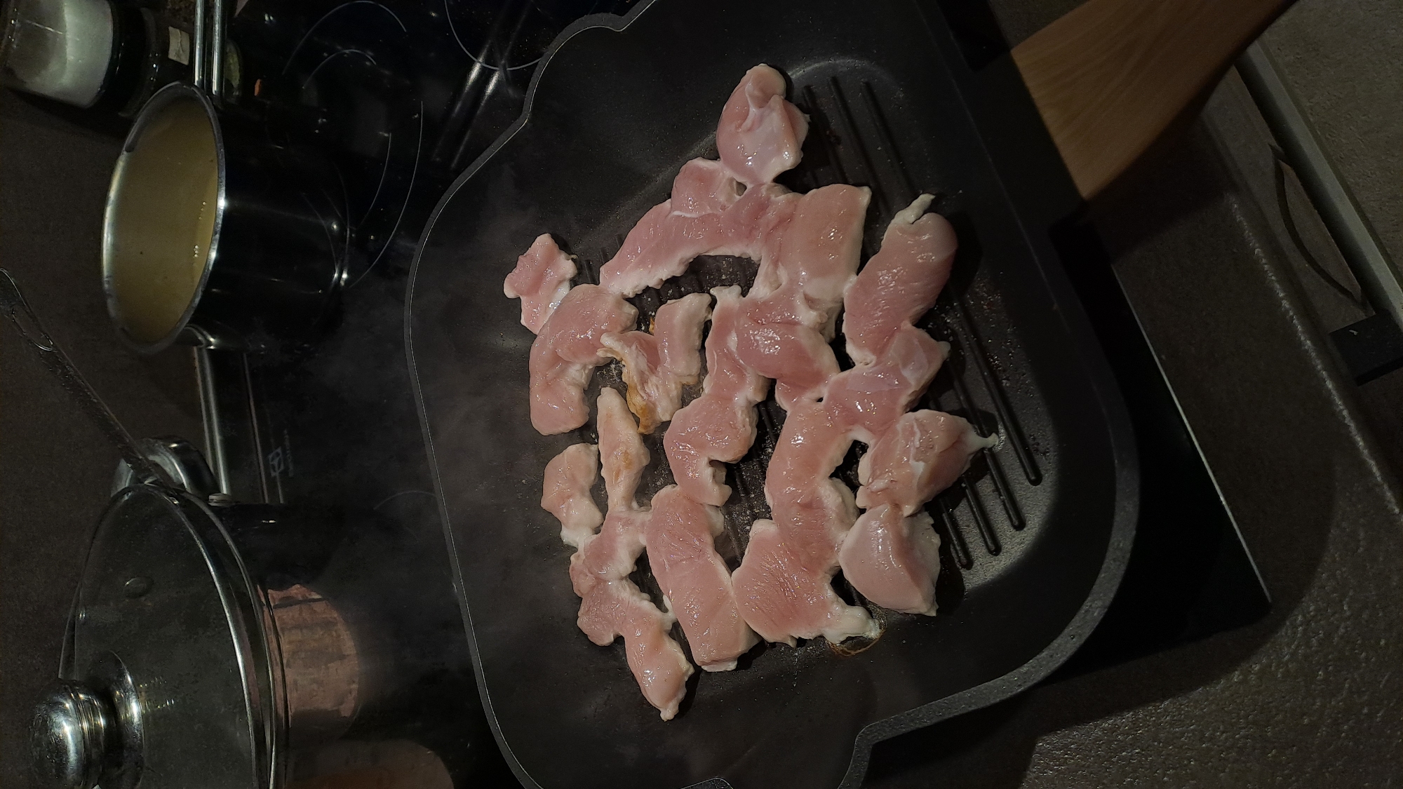 An overhead view captures an active cooking scene within a kitchen in Varna, Bulgaria. The central focus is a black, rectangular griddle pan resting on a dark induction cooktop, containing approximately twenty irregularly shaped pieces of raw or lightly seared light pink poultry meat, from which visible steam emanates. The cooktop features circular hobs, with a partial "Electrolux" brand logo discernible. To the upper left, a large, lidded metallic pot with a glass lid, exhibiting condensation, occupies a rear hob. To the upper right, a smaller, open metallic pot containing a yellowish-brown liquid is positioned on another rear hob. The cooktop is integrated into a dark countertop. A section of a light-colored wooden spatula handle is visible in the bottom right corner, extending towards the griddle pan.
