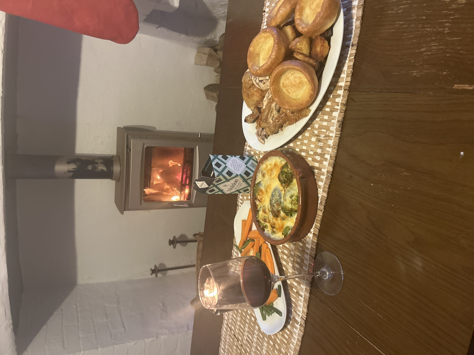 The image displays an indoor setting, likely a dining area within a residential property in Bristol, United Kingdom. The exact location within Bristol is not discernible from the visual information provided. In the foreground, a dark brown wooden table is partially covered by a light-colored, woven mat. On the mat, a meal is arranged. From left to right: a clear stemmed wine glass filled with red wine, next to a clear glass candle holder containing a lit white candle. To the right of the candle, a white rectangular plate holds cooked carrots and green beans. Adjacent to this, a round terracotta dish contains broccoli florets covered with melted cheese (gratin). Further to the right, a large white oval platter holds roasted poultry (likely chicken or duck), surrounded by several golden-brown Yorkshire puddings and roasted potatoes. Behind the table and food, a small, upright, green and white patterned box, identifiable as "Maldon Sea Salt," stands on the table. The background features a white painted brick wall. Centrally located in the background is a modern, silver-grey metallic wood-burning stove with a visible fire burning inside, emitting an orange glow. A dark metallic flue pipe extends vertically from the top of the stove. To the left of the stove, within a wall alcove, two dark metal fireplace tools are partially visible. To the right of the stove, a stack of cut firewood rests on the floor against the wall. A partial view of a red fabric item, possibly a curtain or festive decoration, is visible on the far right side of the frame. No individuals are present.