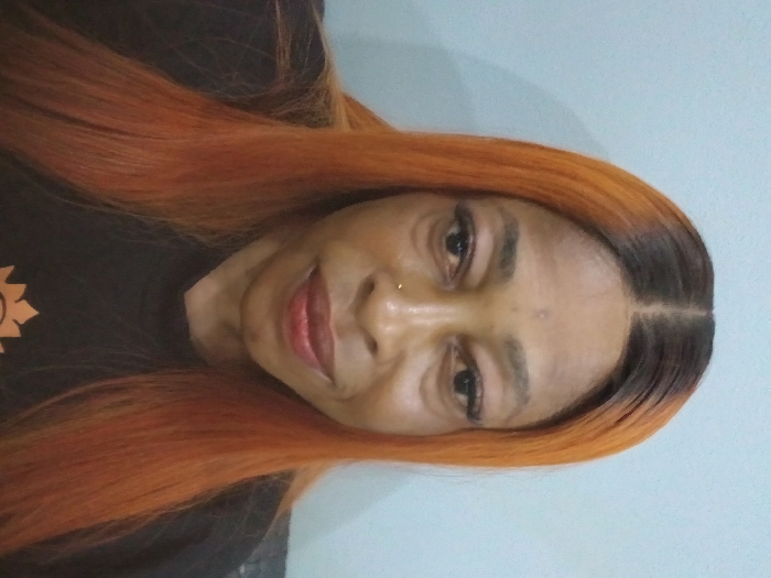 A woman poses for a selfie. She has light skin and long, straight hair that is black at the roots and fades into orange. She is wearing dark lipstick and has a small nose piercing. She wears a dark-colored shirt with an orange symbol on it. The background appears to be a light blue wall. The image is slightly tilted to the left.