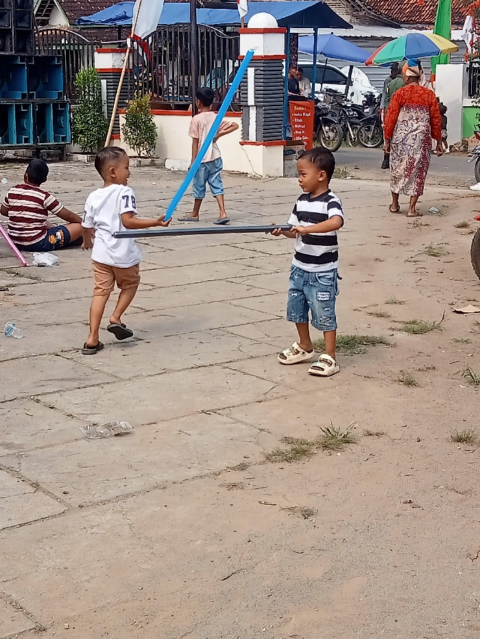 The image depicts an outdoor scene in Sidorejo, Indonesia, under bright daylight. In the foreground, two young boys are engaged in play. The boy on the left wears a white t-shirt with "78" printed on it, brown shorts, and dark flip-flops, holding a light blue PVC pipe horizontally. He faces right, smiling, interacting with the boy on the right. This second boy wears a black and white striped t-shirt, ripped denim shorts, and light-colored sandals, holding a dark, flat rectangular object horizontally, mirroring the first boy's stance. He faces left, smiling. To the left, another boy in a red and white striped t-shirt and dark shorts sits on the paved ground, facing left with a pink object near him. In the mid-ground, a fourth child in a light t-shirt and light blue shorts walks right, holding a long blue object. The ground consists of large, irregular square concrete pavers on the left and a transition to packed dirt with sparse grass on the right. Scattered debris, including empty plastic water bottles, is visible on the ground. In the background, a fence or gate structure with white pillars and red accents, featuring black vertical bars, separates the foreground from further activity. To the far left, a stack of large, light blue and black sound system speakers is present. Behind the fence, several people are visible, including a woman in traditional red and white patterned attire walking away to the right. Under a blue canopy, multiple individuals are gathered, and several motorcycles are parked. A partially visible sign reads "sedian kopi." Another multi-colored umbrella is seen further right. Residential structures are in the far background under a clear sky.
