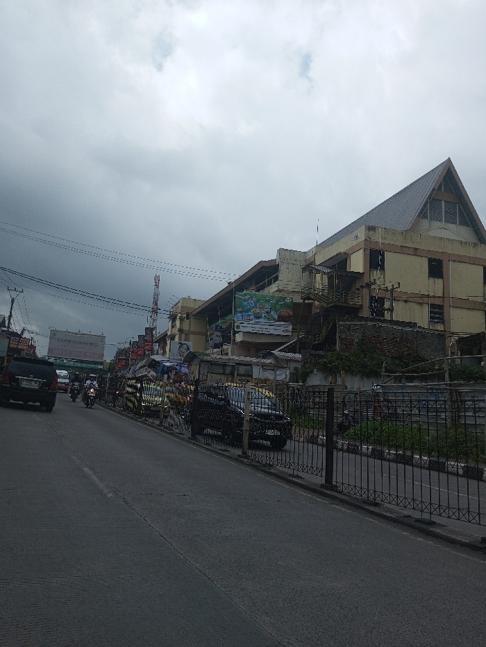 A street scene under a cloudy sky features a mix of vehicles, including a black SUV and motorcycles. The street is lined with a black metal fence, behind which sits a building with a distinctive triangular roof and external stairs. Numerous banners and signs are displayed, and utility lines stretch across the sky. The overall atmosphere appears urban and somewhat overcast.