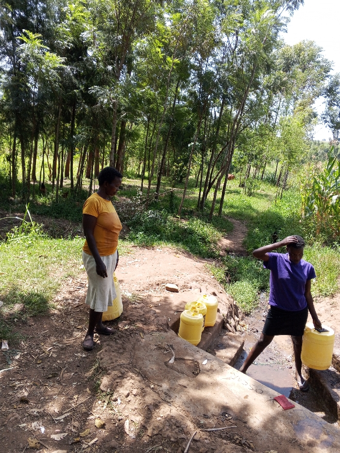 In the Borabu Chitago ward of Kenya, two adult females are present at a water collection point under clear daylight conditions