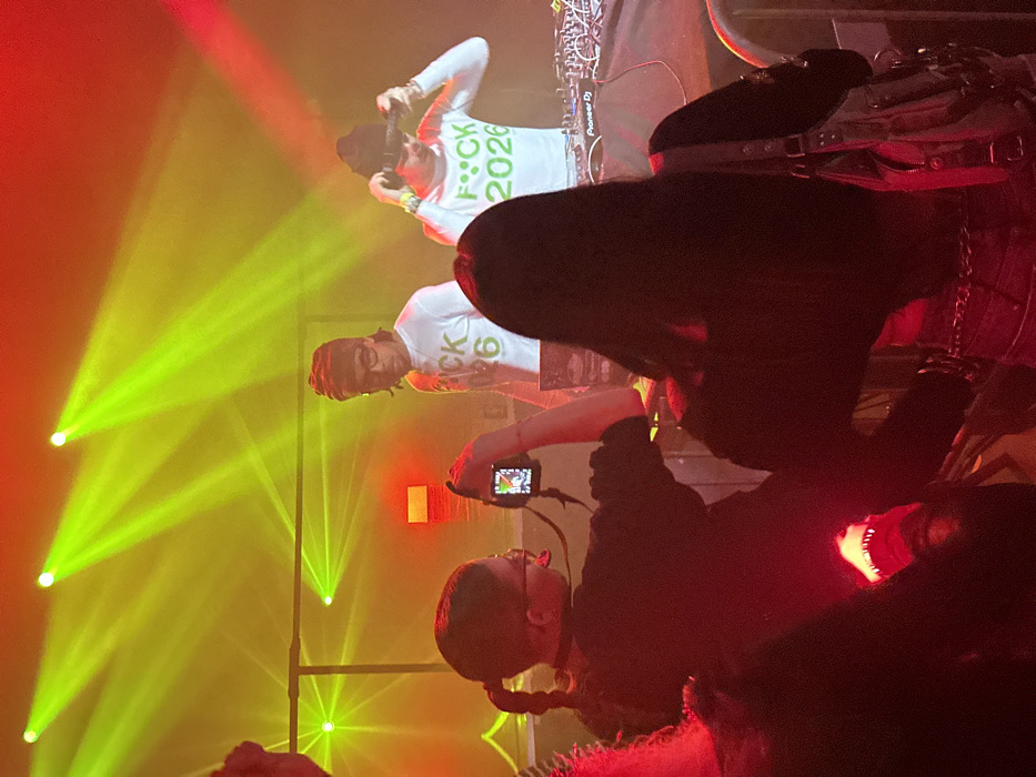 At a concert, two performers on stage wear white shirts printed with "F**CK 2026." One DJs while the other takes photos. Green stage lights illuminate the performers. Audience members are visible in the foreground, including one person filming with a digital camera. Red stage lighting is prominent.