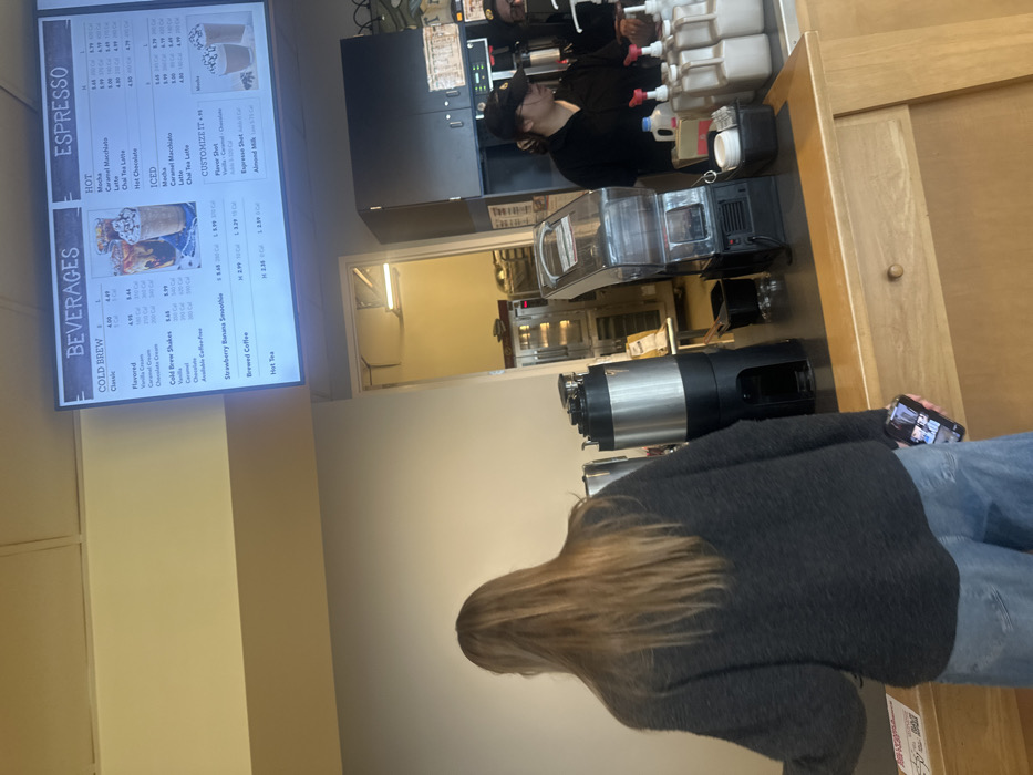 A sideways shot in a coffee shop shows a customer in a gray sweater and jeans looking at her phone. Above her is a coffee brewing station. To the left is a menu board with two sections: "BEVERAGES" and "ESPRESSO". "BEVERAGES" is divided into "COLD BREW" and "Strawberry Banana Smoothie" and "Brewed Coffee" and "Hot Tea". "ESPRESSO" is divided into "HOT", "ICED", and "CUSTOMIZE IT".