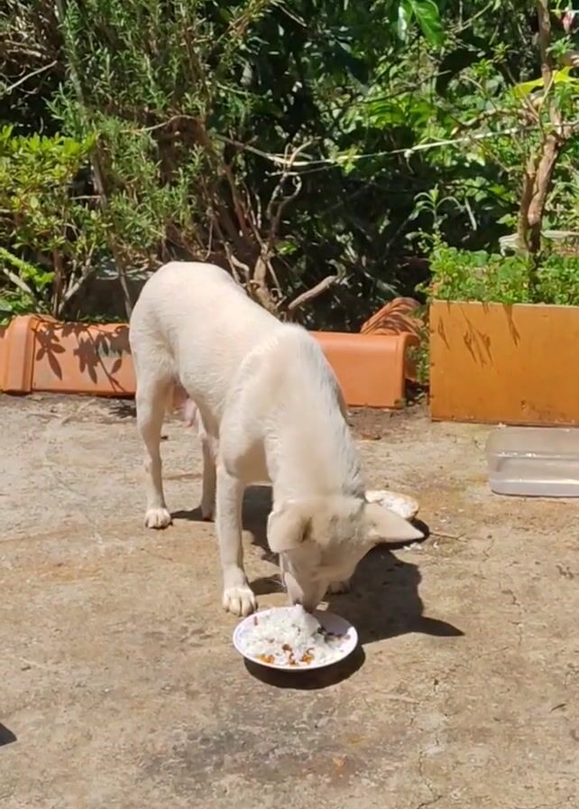 A medium shot shows a white, short-haired dog eating out of a paper plate on a concrete patio. The dog stands over the plate, nose to the ground, and eats with some enthusiasm. The plate is filled with what appears to be rice and some other brownish food. Behind the dog is a garden with several potted plants, including some greenery and a few flower vines. The concrete patio is sunlit and cracked.