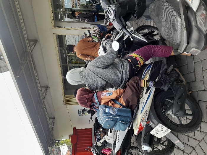 An outdoor scene in the city of Balonggabus, Indonesia, depicts a parking area in front of a white building with large glass windows and a prominent corrugated metal roof overhang. The ground is paved with interlocking grey pavers. In the foreground, an adult, viewed from behind, is seated on a white and black scooter (license plate A 1555 UW 12-28). The adult wears a light grey hooded sweatshirt, a light grey hijab, and purple pants over a colorful patterned undergarment. Behind the adult, a child is seated on the same scooter, also viewed from behind. The child wears a brown uniform (orange-brown long-sleeved top and brown pants/shorts), black shoes, yellow patterned socks, and a reddish-brown hijab. A light blue backpack with a clear plastic water bottle is strapped to the child's back. To the immediate right, the seat and handlebars of another dark grey scooter are visible. In the mid-ground, other individuals and motorcycles are present. A male in a brown t-shirt stands near a parked black scooter, facing away from the camera. Further right, another male in a dark long-sleeved shirt stands near the building's glass entrance. Multiple other scooters and motorcycles are parked throughout the area. A red container or dump truck bed is partially visible on the far left. The sky is overcast, indicating daytime.