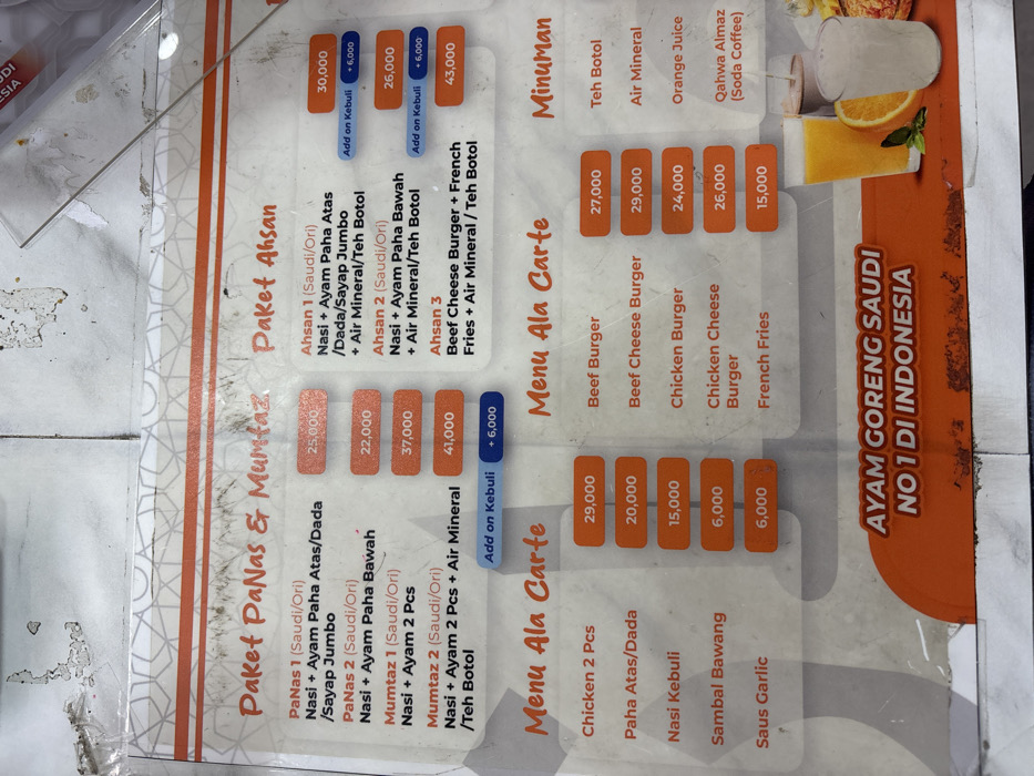menu board with food and drink options. The menu is written in Indonesian. The menu is divided into several sections: Paket Ahsan, Paket Daging, Menu Ala Carte, Menu Ala Carte and Minuman. The menu board is situated in a restaurant, with the coordinates -6.31, 107.165 placing it in the city of Bekasi Regency, Indonesia. The menu board is in a vertical format and contains many different food options, including chicken, beef, and fish. The menu also has a section for drinks. The menu board is made of white plastic and has a glossy finish. The words on the menu board are printed in black, and the prices are listed in orange. The prices range from 6,000 rupiah to 43,000 rupiah. The background is a wall with a beige painted surface. There is no other information available about the scene.