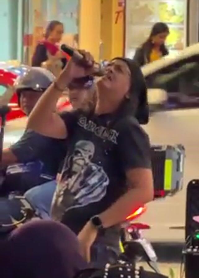 A street musician is performing a song on a busy city street at night. The man has long dark hair and is wearing a black beanie, glasses, a black t-shirt with a graphic, and black pants. He is holding a microphone and singing with enthusiasm. A woman wearing a motorcycle helmet and blue jeans sits on a scooter next to him. Other people are walking by in the background. There is a red car and several storefronts visible. The man has a small amplifier and a set of drum sticks on the ground next to him. The video is shaky and taken from the perspective of someone in the crowd.