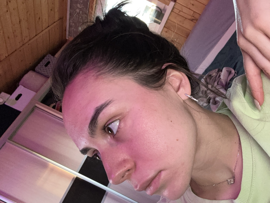 The image displays an indoor scene in посёлок опытного хозяйства «Ермолино», Russia, featuring a young adult female. She is presented in a left profile view, looking upwards and slightly to her left. Her dark hair is pulled back. Her face, particularly the forehead and nose, exhibits a prominent pink hue, likely from ambient lighting. She has dark, defined eyebrows and brown eyes. She wears a light green long-sleeved garment. A silver-colored necklace with a small, square pendant is visible, along with a vertical bar-shaped earring containing multiple small stones in her left earlobe. Her left hand, featuring manicured fingernails, is partially visible in the lower right foreground, resting on her shoulder area. The immediate background on the left consists of a light-colored cabinet or wardrobe reflecting a strong pink light. To the upper right, wooden paneling is visible, alongside a light-colored storage bin with handles. A dark, possibly fabric-covered surface is present in the lower right background, beneath a bright area suggestive of a window or significant light source.